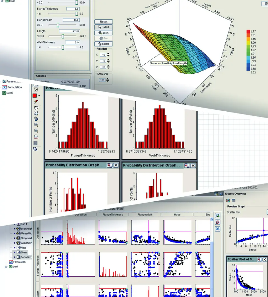 提供了试验设计、优化设计、近似模型和质量工程等一套完整的优化算法包,来帮助用户深入全面的了解产品的设计空间,明晰设计变量与设计目标之间的关系,进而实现多学科多目标优化。
