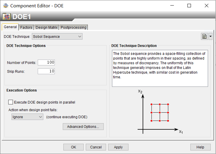 Sobol Sequence技术提供了一个空间填充点集合,这些点在间距上高度一致,这是由差异度量定义的。该技术虽然生成点集所需时间与拉丁超立方体技术类似,但点集的均匀性通常优于拉丁超立方体技术。虽然最优拉丁超立方体技术提供了更大的点集均匀性,但生成时间也相应增加,对于大量的点数和因子来说,这一成本可能会变得非常高。