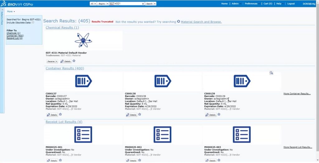 BIOVIA CISPro使组织能够在容器级别上维护每个设施中所有化学品和材料的清单,实时跟踪它们的位置并监控使用情况。可以跟踪具有多个安全层的不限数量的材料分类,包括参考标准。各个业务部门的库存可以独立维护,但可以在同一公司帐户下集中管理。