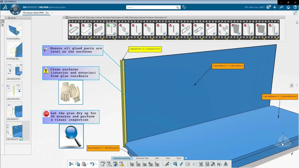 船舶制造工程师的强大功能显然在于设计尽可能自给自足的 3D 工作说明。在最好的情况下,甚至可以完全消除文本说明。用户可以捕捉产品的视点并添加装饰信息、零件、组件和资源的特定颜色或定位、3D 标记(标签、箭头、圆圈、线条标注)、2D 图片(用于说明要使用的必要保护设备或工具的图标和符号)以及用于缩放细节的嵌入式视图。这些视图加上警报、签字和收集的数据足以满足车间执行要求,并可防止语言问题。这些视图可以 2D 或 3D 形式发布以供执行。