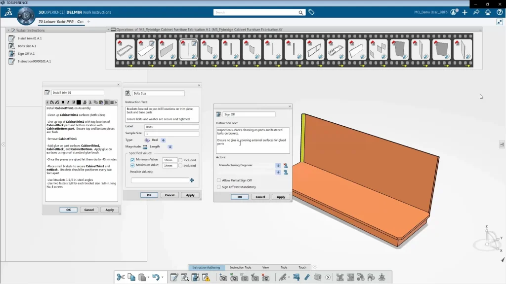 与工艺计划管理完全集成的是用于编写和发布工作指令的应用程序。易于使用的功能可详细记录任何流程,从简单的装配原型设计到复杂的制造或维护流程。通过文本以及使用可视的 2D 和 3D 信息,工作准备人员可以简单地说明如何完成工作。工作指令的最佳实践可以存储并捕获在库中,以供其他作者使用。该角色还支持将 2D 和 3D 工作指令交付到车间。当与 DELMIA 制造运营管理 (MOM) 交互时,工艺计划和相应的工作指令将直接推送到车间工人的执行屏幕。