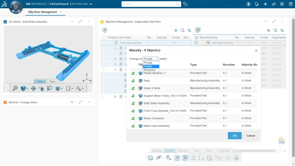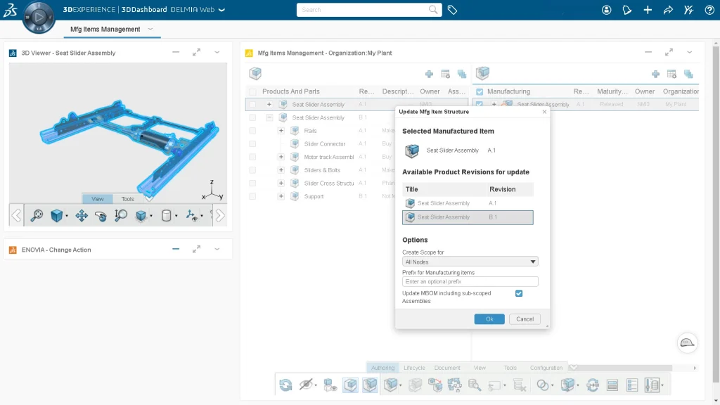 当对工程产品结构进行更新时,MFN 中的工具以及3DEXPERIENCE 平台上的常见更改和配置工具可让用户轻松管理和协调 MBOM 中的更新。制造项目工程师可让用户轻松了解工程变更在工程流程的任何阶段如何影响制造项目结构。