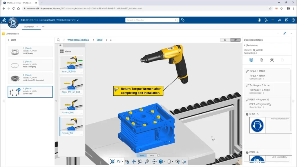 使用工作指令作者 (PWD) 的专用命令发布制造流程和相关工作指令后,用户可以通过桌面或移动设备上的 Web 浏览器使用 Manufacturing Reviewer 访问这些指令。PWD 的发布命令将 DELMIA 编写的制造流程和工作指令重新编译为轻量级格式,并将其分发给任何制造工程或车间用户以供审查或执行。用户可以选择 3D 或 2D 图形来指导他们完成工作指令体验。