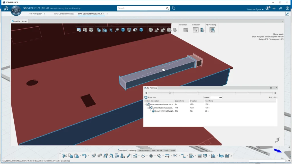 操作在可用的制造系统之间保持平衡。这指的是代表生产线/工位的逻辑资源,或操作发生的逻辑位置。在任何时候,使用 4DPlay(4D = 3D + 时间)功能,工艺工程师都可以查看产品的虚拟组装顺序。4DPlaying 有助于确保计划的完成并解决组装顺序中的潜在问题。