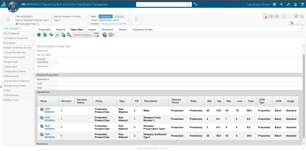 ENOVIA 3DEXPERIENCE 产品规范作者 (GLS) 角色可确保在扩展企业中共享通用产品规范。产品规格书作者帮助定义和管理任何类型的产品规格,包括但不限于配方、原材料、包装组件和工作说明。