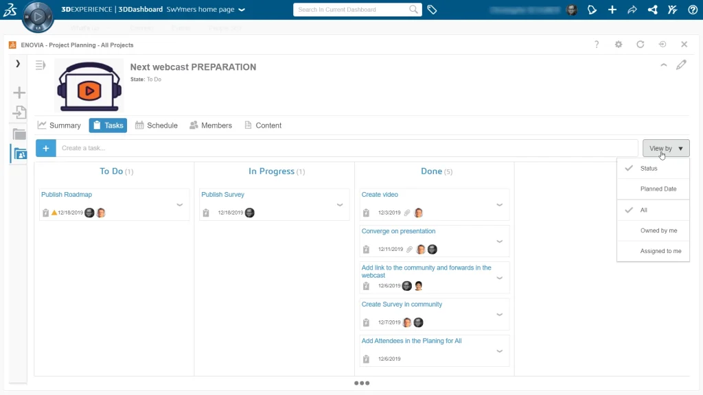 附件(任务执行的输入)和可交付成果(已完成任务的输出)可以与项目本身和单个项目任务相关联。任务分配者可以连接来自 3DDrive、3DSpace 和 3DSwYm 的附件和可交付成果,并且团队成员始终可以查看最新的迭代——前提是他们具有适当的安全访问权限。