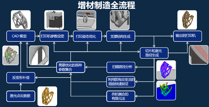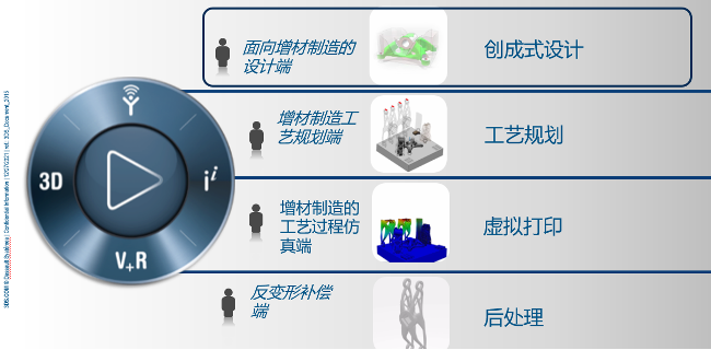 达索系统增材制造解决方案实现了端到端一体化全流程解决方案,可以实现从原材料研究到创成式设计、工艺设计、工艺仿真仿真、并且还延续到增材制造完成后的热处理、线切割等工艺,涵盖了各个方面的内容。