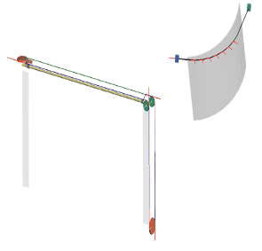 绳索的接触基于2D投影的方式,该力元在后处理中可对绳索路径的网格、分布式交互作用力及该元件的一些特定结果进行输出,该方法特别适用于大型的绳索传动系统,能够在早期刚性和柔性机构设计中实现预测绳索传动相互作用力、摩擦损失或滑动等分析。