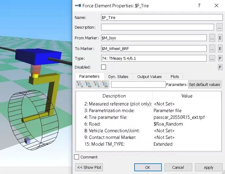 控制元件CE158‘Susp. Kinemat. Sensor Steering’增加了新的输入参数par(7) ‘Marker on steering wheel’和par(8) ‘Marker on rim’。