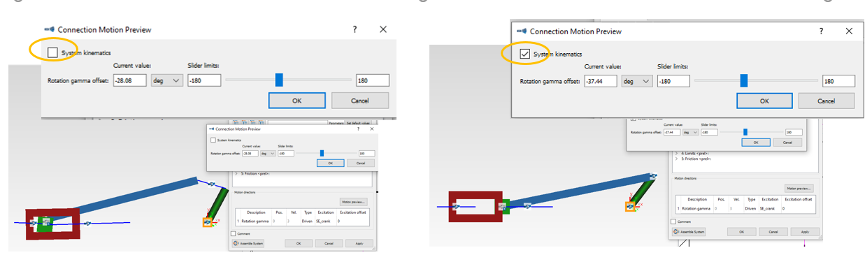 新版本中joint及connection的连接增加了新的“系统运动”的交互模式,使用者执行运动预览或“交互式编辑状态”时可以预览完整的系统的运动。之前版本的交互模式只执行单部件的运动学。