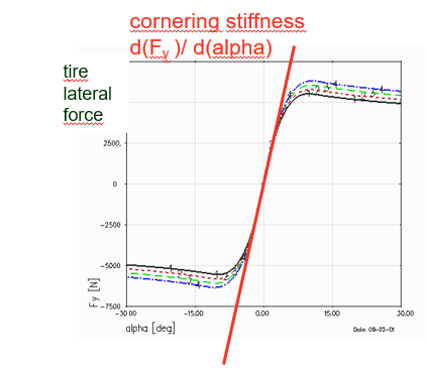 轮胎侧偏刚度是轮胎侧向力与轮胎侧偏角的导数;取决于轮胎垂直载荷和大轮胎横向力的非线性。