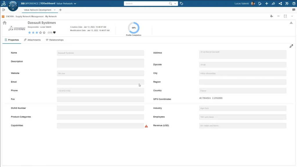 ENOVIA 3DEXPERIENCE 供应网络经理 (PTN-OC) 角色使公司能够集中处理关键供应商信息和关系定义,例如地址、服务的行业、关键联系信息和地理位置。