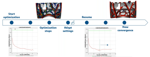 支持使用修改的设置继续优化。允许用户继续提前结束的优化,也可以更改设计周期的最大数量,允许修改收敛设置而无需重新运行整个优化,能极大节省计算时间。
